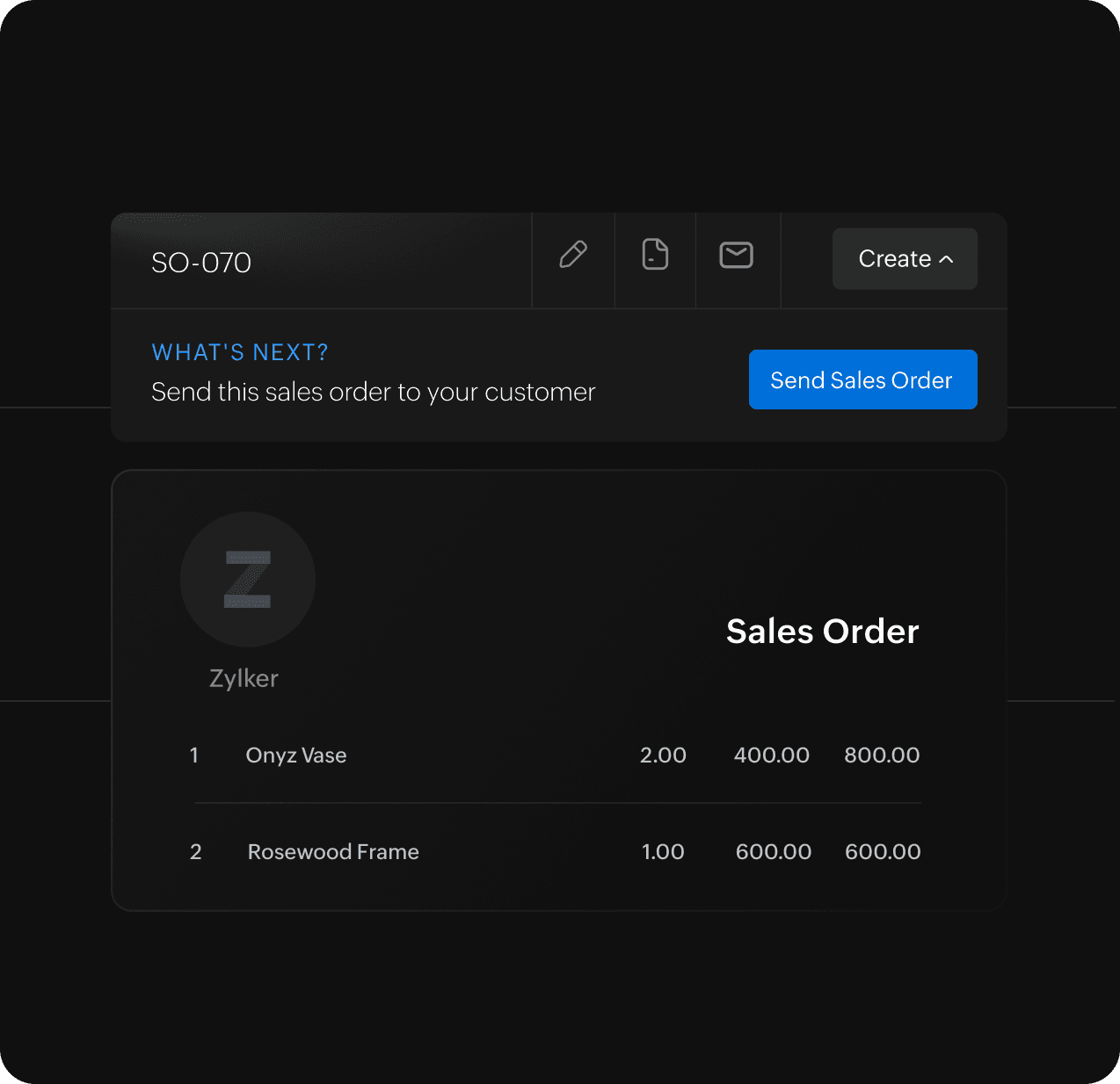 Create clones, print out a copy, or simply share sales orders over email with your team. You may also share with customers on the customer portal.